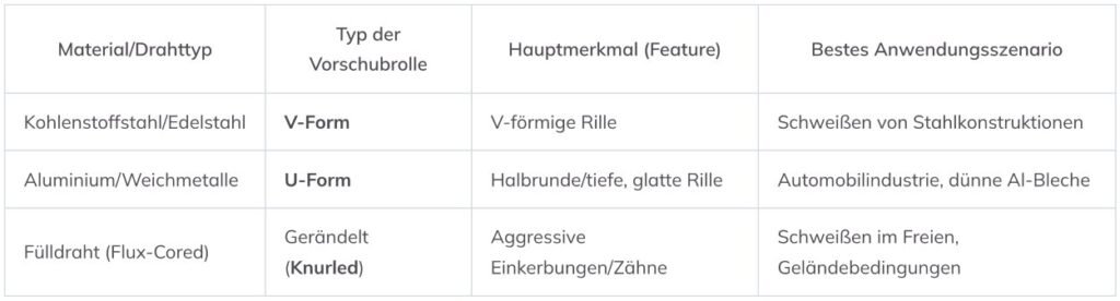 Tabelle: Auswahl der Vorschubrolle in Bezug auf das Schweißmaterial