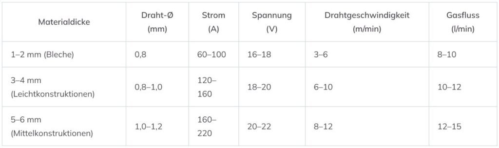 Die folgende Tabelle zeigt die Basiswerte für Kohlenstoffstahl bei Verwendung des Schutzgases M21 (Ar+CO₂).