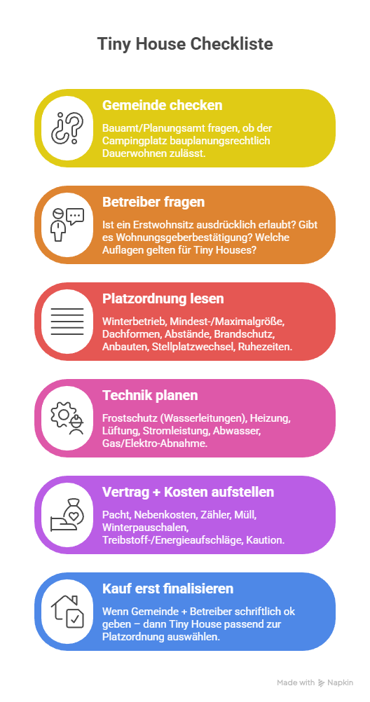 6. Kauf erst finalisieren: Wenn Gemeinde + Betreiber schriftlich ok geben – dann Tiny House passend zur Platzordnung auswählen.